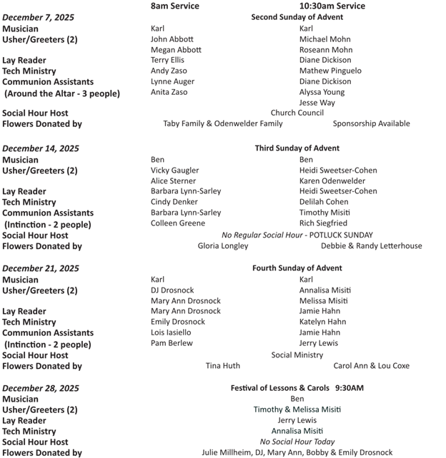 New Member forms are available in the Narthex. The Interfaith Concert will be December 7 at 6pm at Holy Cross. Rabbi Shulman presents “How Jesus Fulfills the Old Testament” on December 14 at 9:15am. Nominations are needed for three Council members and 2 Elders. Congregational Meeting will be held on January 25, 2026.