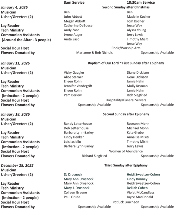 Secretary’s Report – All ministries/committee leaders will need to turn in a year-end report by December 23, 2025 to allow enough time to prepare packets for the Annual Meeting on January 25, 2026. Kistler O’Brien annual fire alarm inspection was done on December 11 and went well. Church office will be closed from December 24, 2025 – January 2, 2026.
